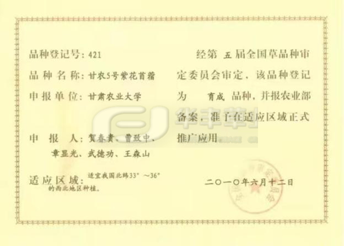 甘農(nóng)5號(hào)(Gannong No.5)秋眠級(jí)為10-11級(jí),為非秋眠性品種,春夏前期和秋季后期長速明顯高于一般品種,可在我國南方地區(qū)種植;近年在北緯33-36°之間的北方地區(qū)種植表明,在平均氣溫-5.6℃以上時(shí)可安全越冬,在平均氣溫-7.2℃時(shí),越冬率有所降低,是國內(nèi)第1次在北緯地區(qū)制種和應(yīng)用的高秋眠級(jí)苜蓿品種。